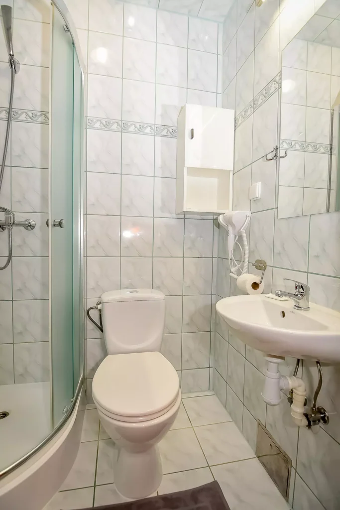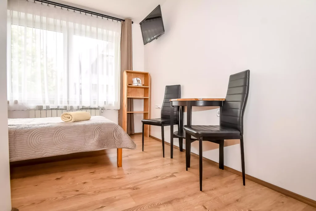 Rozgość się w 1-osobowym pokoju z kompletnym wyposażeniem. Czeka na Ciebie: wygodne łóżko, stolik i krzesła, TV, Wi-Fi oraz czajnik. W łazience znajdziesz: prysznic, mydło i ręczniki. Dodatkowo w obiekcie: aneks kuchenny, z mikrofalą, lodówką, ekspresem do kawy i tosterem. Na życzenie Gości udostępniamy deskę do prasowania, żelazko, a także suszarkę do włosów.