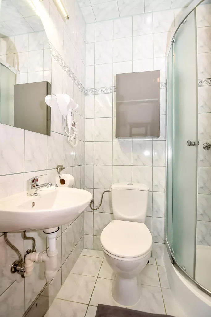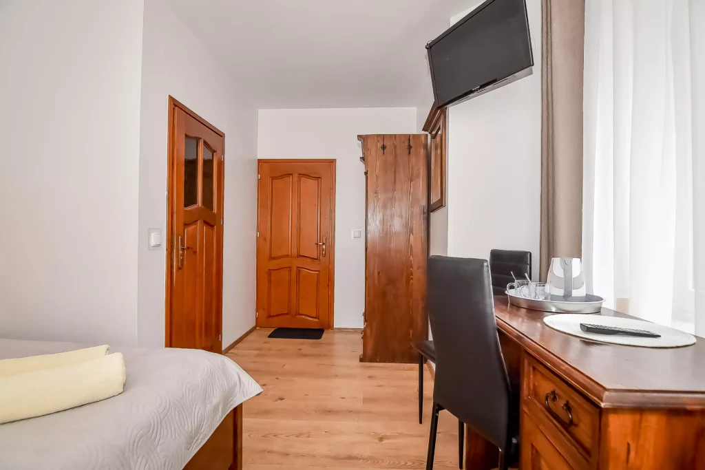 Rozgość się w przytulnym pokoju 2-osobowym z kompletnym wyposażeniem. Znajdziesz w nim: wygodne łóżko małżeńskie, stolik i krzesła, TV, Wi-Fi oraz czajnik. W łazience: prysznic, mydło i ręczniki. Dodatkowo w obiekcie: aneks kuchenny, z mikrofalą, lodówką, ekspresem do kawy i tosterem. Na życzenie Gości udostępniamy deskę do prasowania, a także suszarkę do włosów.