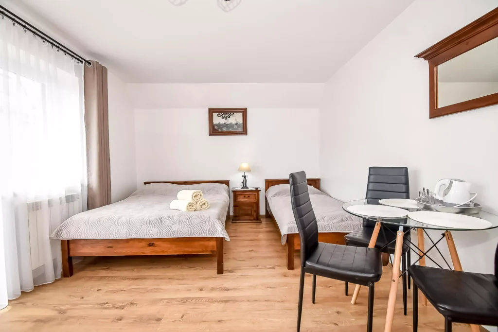 Rozgość się w przytulnym pokoju 3-osobowym z kompletnym wyposażeniem. Znajdziesz w nim: wygodne łóżko małżeńskie, łóżko pojedyncze, stolik i krzesła, TV, Wi-Fi oraz czajnik. W łazience: prysznic, mydło i ręczniki. Dodatkowo w obiekcie: aneks kuchenny, z mikrofalą, lodówką, ekspresem do kawy i tosterem. Na życzenie Gości udostępniamy deskę do prasowania, żelazko oraz suszarkę do włosów.